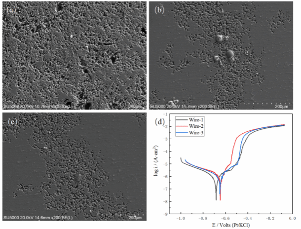 图4. 焊缝区不同焊接接头的腐蚀形貌:(a) Wire-1;(b)Wire-2; (c) Wire-3; (d)不同焊接接头的极化曲线