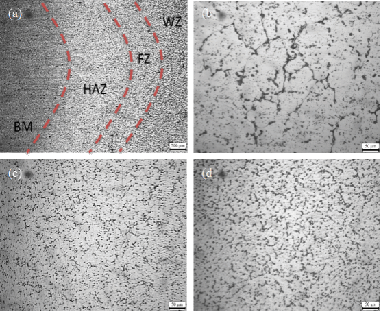 图1. 焊接接头截面光学显微组织:(a) Wire-2焊接接头外观;(b)Wire-1焊缝区;(c)Wire-2焊缝区;(d) Wire-3焊缝区