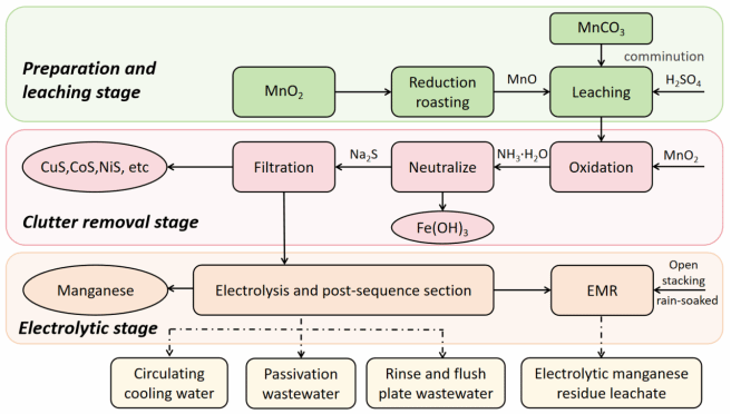 电解锰是钢铁、新能源等领域的核心原料,但其生产过程中产生的废水(EMW)因含高浓度锰、氨氮及酸性污染物,长期威胁生态环境。论文指出,中国作为全球最大电解锰生产国,历史积存锰渣超5000万吨,其渗滤液锰浓度可达1533 mg/L,远超排放标准(1 mg/L)。未经处理的废水不仅抑制植物生长,更可能通过食物链引发人体神经系统疾病,治理需求迫切。