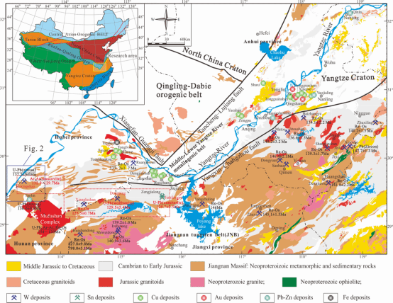 图1. 江南钨矿带区域地质图(据Mao et al., 2017和Xu et al., 2020修改)