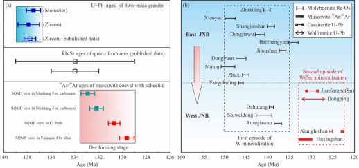 图3. (a)虎形山成岩成矿时代格架;(b)江南钨矿带从东向西成矿时代变化