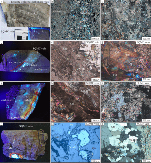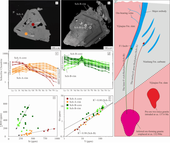 (2)白钨矿矿物组合、阴极发光(CL)结构及微量元素的差异揭示:SQMC型脉中的Sch-A与SQMF型脉中的Sch-B形成于两个不同的岩浆热液流体脉冲——前者源自贫氟(F含量低)、高锶(Sr)且低稀土元素(REE)浓度的流体,后者则形成于富氟(F含量高)、低锶但高稀土浓度的流体。